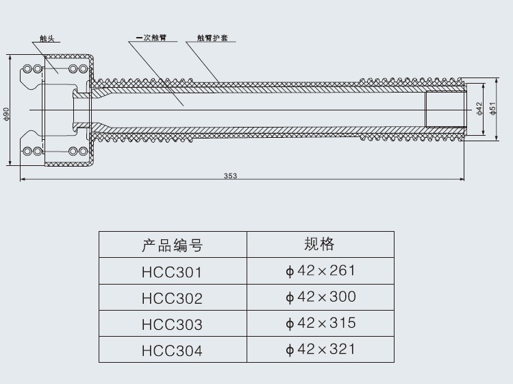 產品編號HCC301-304 (專利號ZL200630008757.1) 名稱:630A觸臂 材料:紫銅T2(套硅橡膠專利型)
