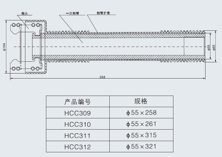 產品編號HCC309-312 (專利號ZL200630008757.1) 名稱:1600A觸臂 材料:紫銅T2(套硅橡膠專利型)