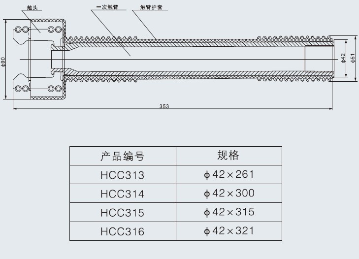 產品編號HCC313-316 (專利號ZL200630008757.1) 名稱:630A觸臂 材料:鋁(套硅橡膠專利型)